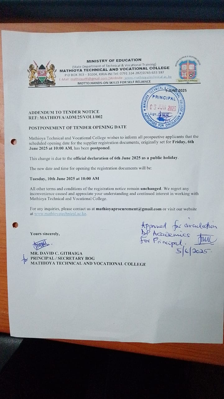 Mathioya TVC wishes to inform all the prospective supplier applicants that the scheduled documents opening date has been postponed due to declared official public holiday on Friday the 6th June 2025.